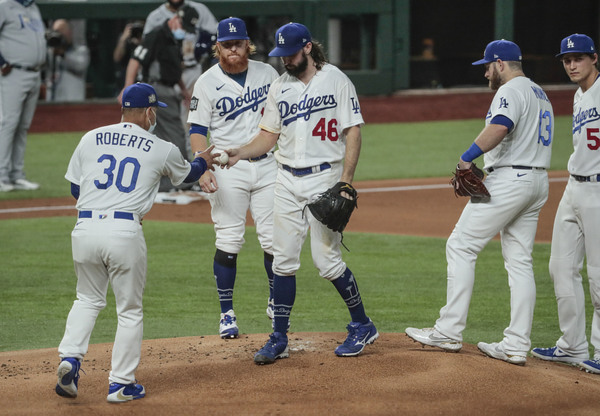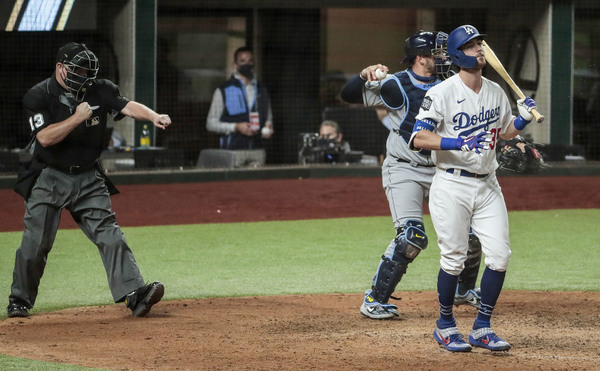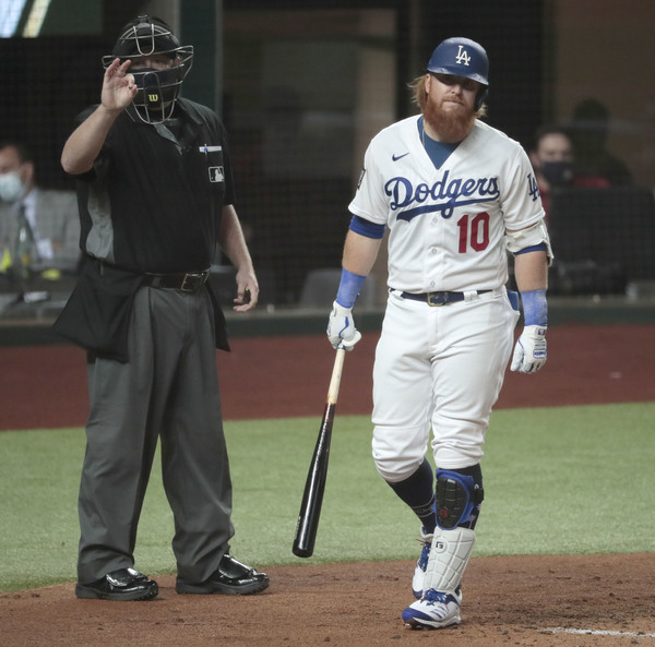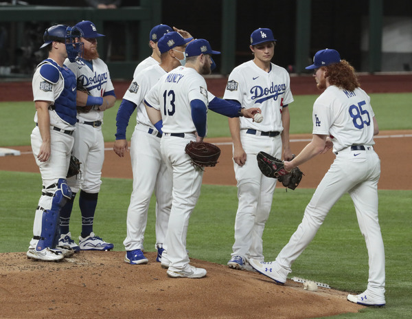 The Los Angeles Dodgers' Cody Bellinger strikes out in the eighth inning against the Tampa Bay Rays in Game 2 of the World Series at Globe Life Field in Arlington, Texas, on Wednesday, Oct. 21, 2020. The Rays won, 6-4, to even the series. (Robert Gauthier/Los Angeles Times/TNS)Los Angeles Dodgers starting pitcher Tony Gonsolin (46) is removed from the game by manager Dave Roberts (30) in the second inning against the Tampa Bay Rays in Game 2 of the World Series at Globe Life Field in Arlington, Texas, on Wednesday, Oct. 21, 2020. (Robert Gauthier/Los Angeles Times/TNS)Los Angeles Dodgers pitcher Dustin May holds his head after giving up a two-run double to the Tampa Bay Rays in the fourth inning in Game 2 of the World Series at Globe Life Field in Arlington, Texas, on Wednesday, Oct. 21, 2020. (Wally Skalij/Los Angeles Times/TNS)Los Angeles Dodgers starting pitcher Tony Gonsolin throws the first inning against the Tampa Bay Rays in Game 2 of the World Series at Globe Life Field in Arlington, Texas, on Wednesday, Oct. 21, 2020. (Robert Gauthier/Los Angeles Times/TNS)Los Angeles Dodgers pitcher Victor Gonzalez (81) looks skyward after leaving the mound in the fourth inning against the Tampa Bay Rays in Game 2 of the World Series at Globe Life Field in Arlington, Texas, on Wednesday, Oct. 21, 2020. (Robert Gauthier/Los Angeles Times/TNS)The Tampa Bay Rays' Manuel Margot (13) is tagged out at home by Los Angeles Dodgers catcher Will Smith on a throw from shortstop Corey Seager in the second inning in Game 2 of the World Series at Globe Life Field in Arlington, Texas, on Wednesday, Oct. 21, 2020. (Wally Skalij/Los Angeles Times/TNS)Tampa Bay Rays relief pitcher Diego Castillo celebrates after the final out in a 6-4 series-tying win against the Los Angeles Dodgers in Game 2 of the World Series at Globe Life Field in Arlington, Texas, on Wednesday, Oct. 21, 2020. (Robert Gauthier/Los Angeles Times/TNS)The Tampa Bay Rays' Manuel Margot, left, is tagged out at home by Los Angeles Dodgers catcher Will Smith on a throw from shortstop Corey Seager in the second inning in Game 2 of the World Series at Globe Life Field in Arlington, Texas, on Wednesday, Oct. 21, 2020. (Robert Gauthier/Los Angeles Times/TNS)The Los Angeles Dodgers' Chris Taylor hits a two-run home run in the fifth inning against the Tampa Bay Rays in Game 2 of the World Series at Globe Life Field in Arlington, Texas, on Wednesday, Oct. 21, 2020. (Robert Gauthier/Los Angeles Times/TNS)Tampa Bay Rays starting pitcher Blake Snell throws against the Los Angeles Dodgers in Game 2 of the World Series at Globe Life Field in Arlington, Texas, on Wednesday, Oct. 21, 2020. (Robert Gauthier/Los Angeles Times/TNS)The Los Angeles Dodgers' Cody Bellinger strikes out in the eighth inning against the Tampa Bay Rays in Game 2 of the World Series at Globe Life Field in Arlington, Texas, on Wednesday, Oct. 21, 2020. The Rays won, 6-4, to even the series. (Robert Gauthier/Los Angeles Times/TNS)The Tampa Bay Rays' Manuel Margot, right, is greeted by teammate Willy Adames after scoring in the fourth inning against the Los Angeles Dodgers in Game 2 of the World Series at Globe Life Field in Arlington, Texas, on Wednesday, Oct. 21, 2020. (Robert Gauthier/Los Angeles Times/TNS)Los Angeles Dodgers infielders Justin Turner (10) and Corey Seager (5) share a light moment on the field after Seager chased down a fly ball for the final out of the third inning against the Tampa Bay Rays in Game 2 of the World Series at Globe Life Field in Arlington, Texas, on Wednesday, Oct. 21, 2020. (Robert Gauthier/Los Angeles Times/TNS)Los Angeles Dodgers infielder Corey Seager (5) chases down a fly ball to make the catch to end the third inning against the Tampa Bay Rays in Game 2 of the World Series at Globe Life Field in Arlington, Texas, on Wednesday, Oct. 21, 2020. (Wally Skalij/Los Angeles Times/TNS)The Los Angeles Dodgers' Corey Seager hits a solo home run in the eighth inning against the Tampa Bay Rays in Game 2 of the World Series at Globe Life Field in Arlington, Texas, on Wednesday, Oct. 21, 2020. The Rays won, 6-4, to even the series. (Wally Skalij/Los Angeles Times/TNS)The Los Angeles Dodgers' Corey Seager hits a solo home run in the eighth inning against the Tampa Bay Rays in Game 2 of the World Series at Globe Life Field in Arlington, Texas, on Wednesday, Oct. 21, 2020. The Rays won, 6-4, to even the series. (Robert Gauthier/Los Angeles Times/TNS)The Los Angeles Dodgers' Justin Turner (10) is unhappy with the strikeout call of umpire Todd Tichenor in the first inning against the Tampa Bay Rays in Game 2 of the World Series at Globe Life Field in Arlington, Texas, on Wednesday, Oct. 21, 2020. (Robert Gauthier/Los Angeles Times/TNS)The Tampa Bay Rays' Manuel Margot is tagged out at home by Los Angeles Dodgers catcher Will Smith (16) on a throw from shortstop Corey Seager in the second inning in Game 2 of the World Series at Globe Life Field in Arlington, Texas, on Wednesday, Oct. 21, 2020. (Robert Gauthier/Los Angeles Times/TNS)Tampa Bay Rays relief pitcher Diego Castillo celebrates after the final out in a 6-4 series-tying win against the Los Angeles Dodgers in Game 2 of the World Series at Globe Life Field in Arlington, Texas, on Wednesday, Oct. 21, 2020. (Wally Skalij/Los Angeles Times/TNS)Los Angeles Dodgers pitcher Tony Gonsolin throws in the first inning against the Tampa Bay Rays in Game 2 of the World Series at Globe Life Field in Arlington, Texas, on Wednesday, Oct. 21, 2020. (Wally Skalij/Los Angeles Times/TNS)The Los Angeles Dodgers' Max Muncy (13) walks back to the dugout after striking out against the Tampa Bay Rays in the fourth inning as teammates, from left, Chris Taylor, Clayton Kershaw, Joc Pederson and Justin Turner, look on against the Tampa Bay Rays in Game 2 of the World Series at Globe Life Field in Arlington, Texas, on Wednesday, Oct. 21, 2020. The Rays won, 6-4, to even the series. (Wally Skalij/Los Angeles Times/TNS)Los Angeles Dodgers pitche