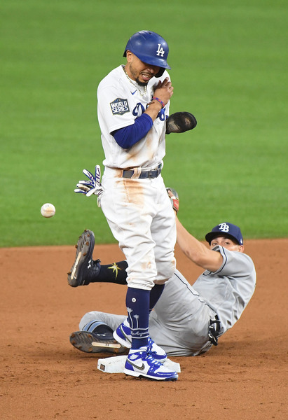 The Los Angeles Dodgers' Mookie Betts collides with Tampa Bay Rays shortstop Willy Adames after reaching second base safely in the fifth inning in Game 2 of the World Series at Globe Life Field in Arlington, Texas, on Wednesday, Oct. 21, 2020. (Wally Skalij/Los Angeles Times/TNS)