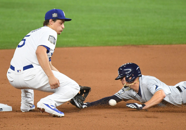Los Angeles Dodgers shortstop Corey Seager, left, tags out Tampa Bay Rays baserunner Willy Adames on a steal attempt in the second inning in Game 2 of the World Series at Globe Life Field in Arlington, Texas, on Wednesday, Oct. 21, 2020. (Wally Skalij/Los Angeles Times/TNS)