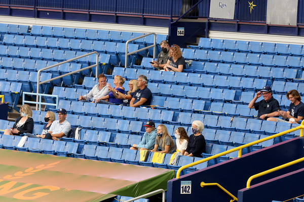 Family members of the Rays and Blue Jays who are in quarantine with the players were allowed in the 200 level on opposite sides of the press box, non-quarantined family members were in the outfield seats and Rays team employees in the party deck above leftfield.