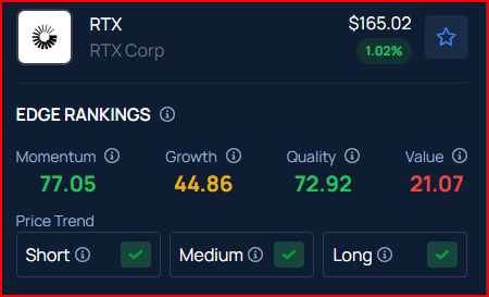 Benzinga's Edge Rankings place Raytheon in the 73rd percentile for quality and the 21st percentile for value, reflecting mixed performance. Check the detailed report here.