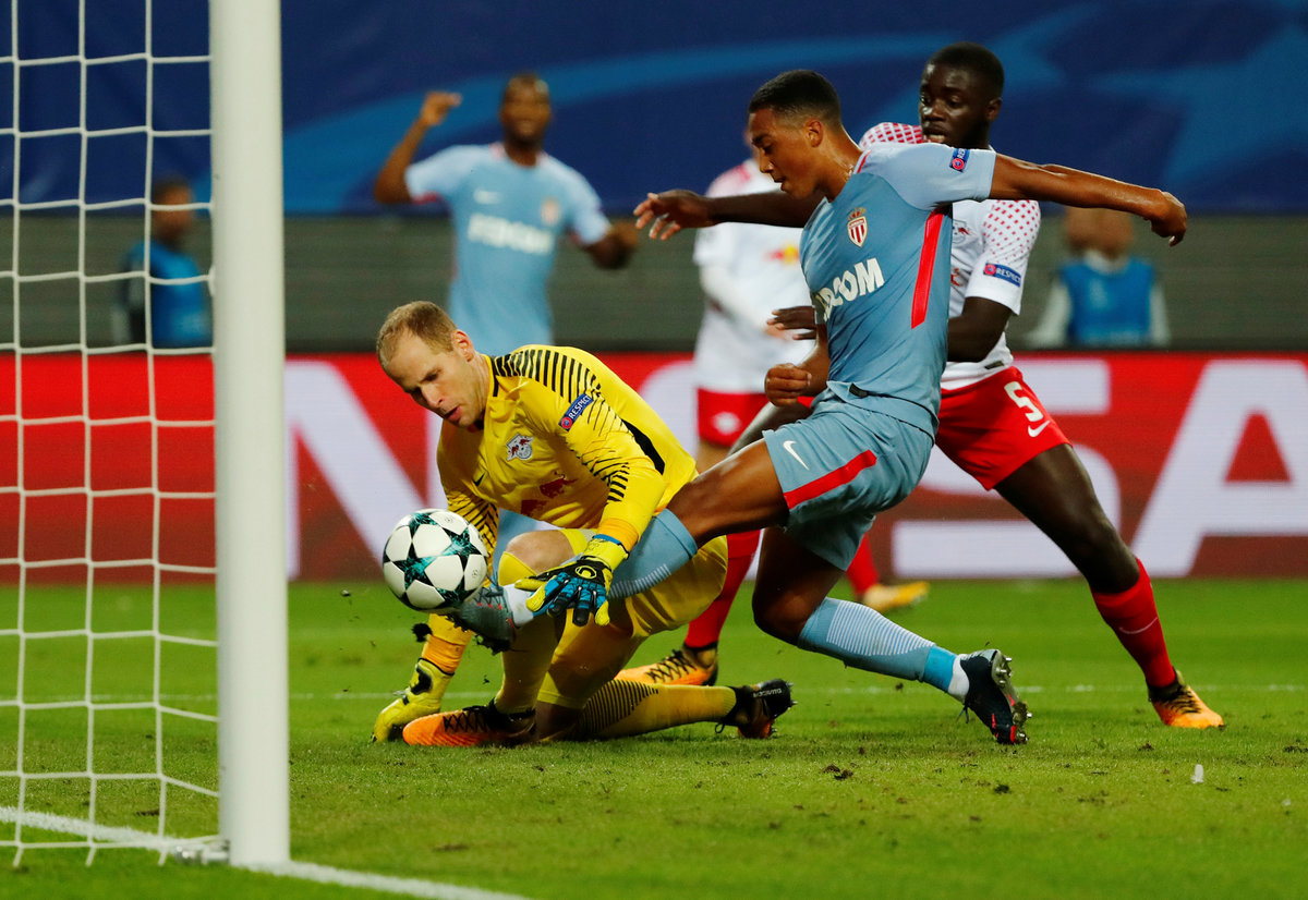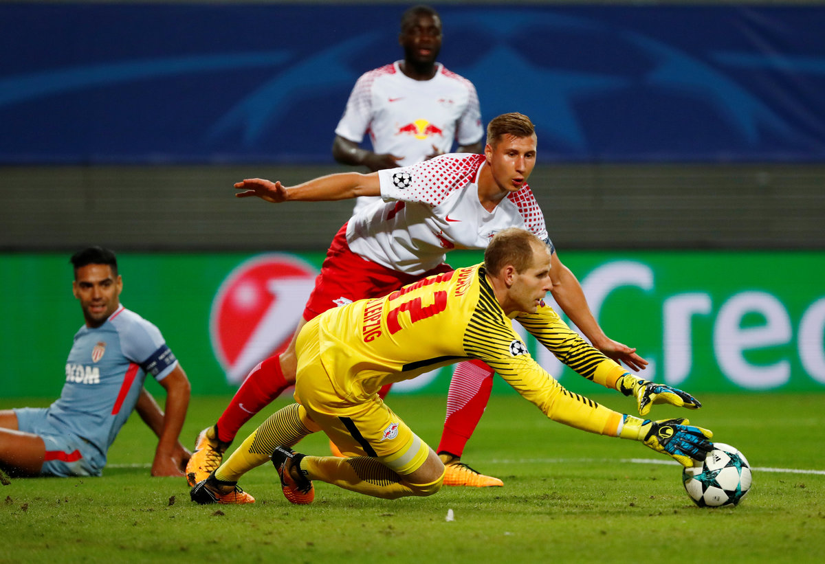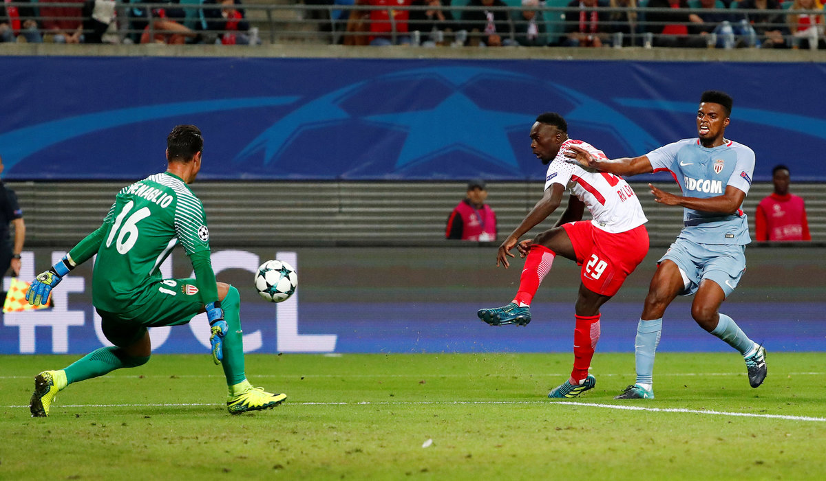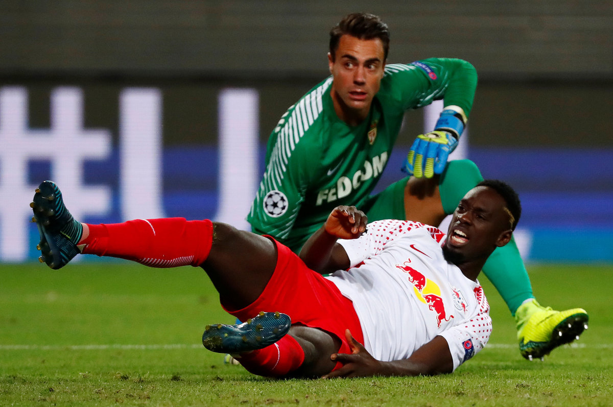Soccer Football - Champions League - RB Leipzig vs AS Monaco - Red Bull Arena, Leipzig, Germany - September 13, 2017 RB Leipzig's Jean-Kevin Augustin and Monaco's Diego Benaglio react after a missed chance REUTERS/Fabrizio Bensch