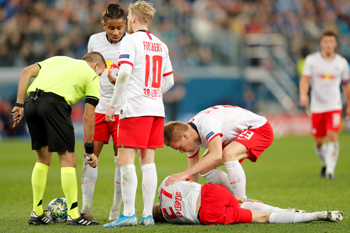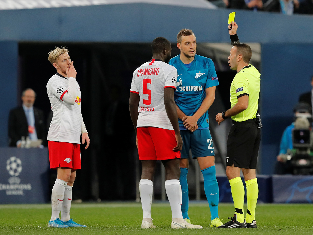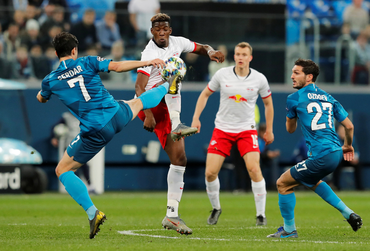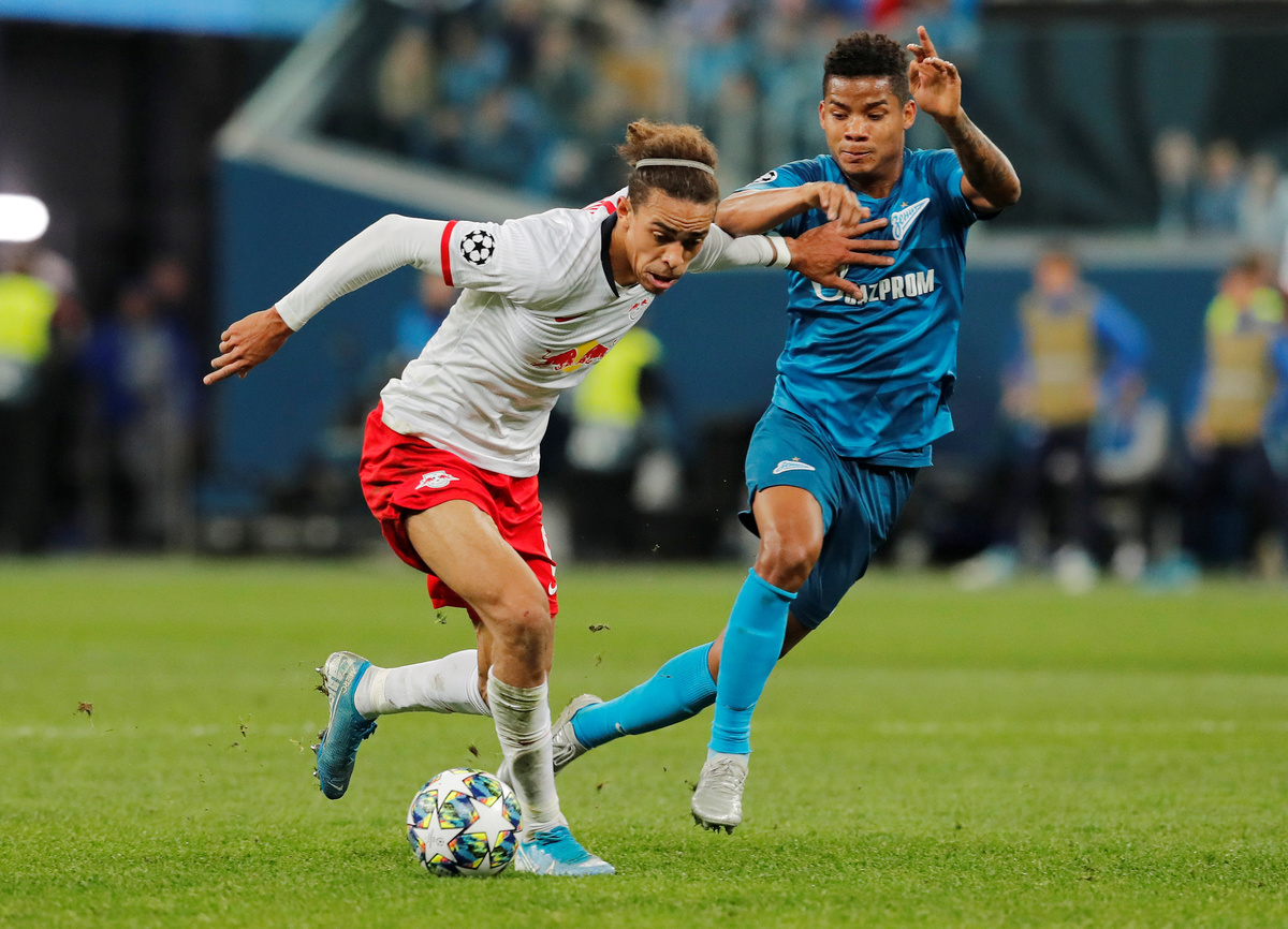 Soccer Football - Champions League - Group G - Zenit Saint Petersburg v RB Leipzig - Gazprom Arena, Saint Petersburg, Russia - November 5, 2019 RB Leipzig's Christopher Nkunku in action with Zenit Saint Petersburg's Yordan Osorio REUTERS/Anton VaganovSoccer Football - Champions League - Group G - Zenit Saint Petersburg v RB Leipzig - Gazprom Arena, Saint Petersburg, Russia - November 5, 2019 RB Leipzig's Christopher Nkunku in action with Zenit Saint Petersburg's Yordan Osorio REUTERS/Anton VaganovSoccer Football - Champions League - Group G - Zenit Saint Petersburg v RB Leipzig - Gazprom Arena, Saint Petersburg, Russia - November 5, 2019 RB Leipzig's Yussuf Poulsen in action with Zenit Saint Petersburg's Wilmar Barrios REUTERS/Anton VaganovSoccer Football - Champions League - Group G - Zenit Saint Petersburg v RB Leipzig - Gazprom Arena, Saint Petersburg, Russia - November 5, 2019 RB Leipzig's Kevin Kampl in action REUTERS/Anton VaganovSoccer Football - Champions League - Group G - Zenit Saint Petersburg v RB Leipzig - Gazprom Arena, Saint Petersburg, Russia - November 5, 2019 Zenit Saint Petersburg's Artem Dzyuba in action with RB Leipzig's Lukas Klostermann REUTERS/Anton VaganovSoccer Football - Champions League - Group G - Zenit Saint Petersburg v RB Leipzig - Gazprom Arena, Saint Petersburg, Russia - November 5, 2019 RB Leipzig's Marcel Halstenberg in action with Zenit Saint Petersburg's Igor Smolnikov REUTERS/Anton VaganovSoccer Football - Champions League - Group G - Zenit Saint Petersburg v RB Leipzig - Gazprom Arena, Saint Petersburg, Russia - November 5, 2019 RB Leipzig's Dayot Upamecano in action with Zenit Saint Petersburg's Artem Dzyuba REUTERS/Anton VaganovSoccer Football - Champions League - Group G - Zenit Saint Petersburg v RB Leipzig - Gazprom Arena, Saint Petersburg, Russia - November 5, 2019 Zenit Saint Petersburg's Artem Dzyuba and RB Leipzig's Dayot Upamecano are shown a yellow card by the referee REUTERS/Anton VaganovSoccer Football - Champions League - Group G - Zenit Saint Petersburg v RB Leipzig - Gazprom Arena, Saint Petersburg, Russia - November 5, 2019 RB Leipzig's Marcel Halstenberg attends to RB Leipzig's Konrad Laimer after he sustains an injury REUTERS/Anton Vaganov