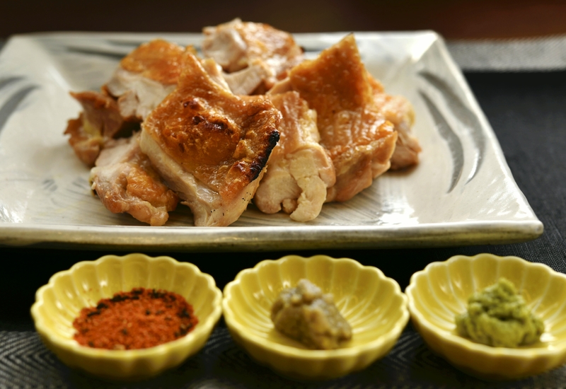 3. Cut the chicken into bite-size pieces and serve with condiments. Powdered sansho pepper also goes well with the dish.