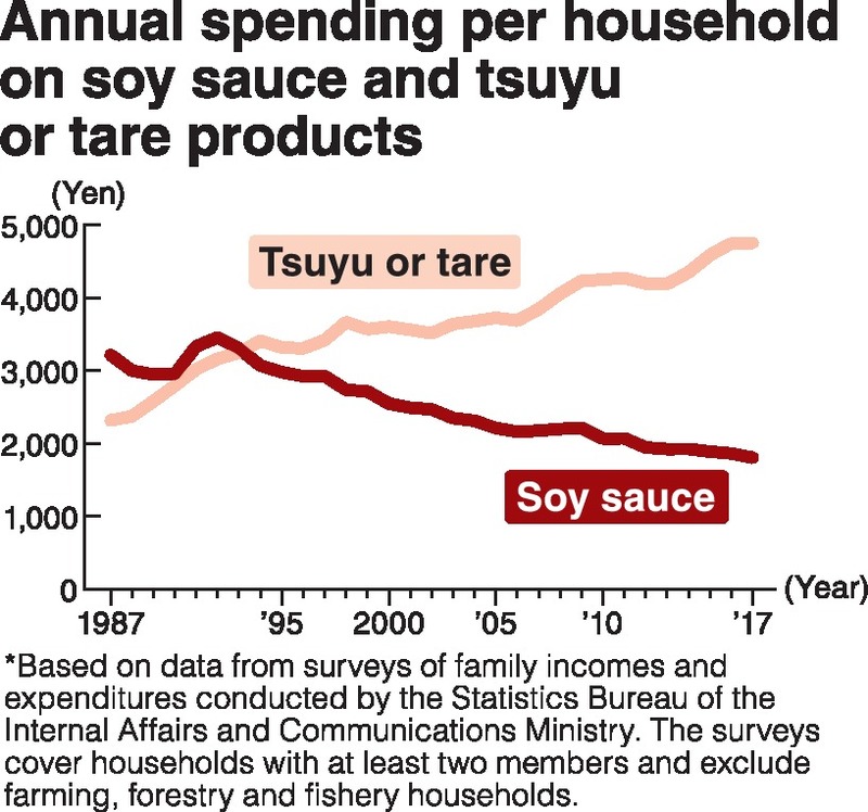 The consumption of tsuyu and tare products has grown significantly. According to surveys on family incomes and expenditures conducted by the Statistics Bureau of the Internal Affairs and Communications Ministry, annual spending per household on tsuyu and tare products surpassed spending on soy sauce in 1994. In 2017, annual spending per household on tsuyu and tare was 2.6 times the amount spent on soy sauce.