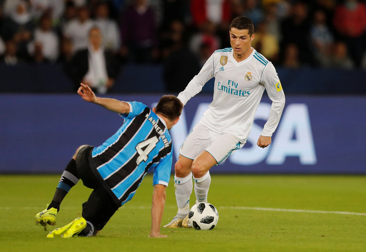 Soccer Football - FIFA Club World Cup Final - Real Madrid vs Gremio FBPA - Zayed Sports City Stadium, Abu Dhabi, United Arab Emirates - December 16, 2017 Real Madrid’s Cristiano Ronaldo in action with Gremio’s Walter Kannemann REUTERS/Amr Abdallah Dalsh