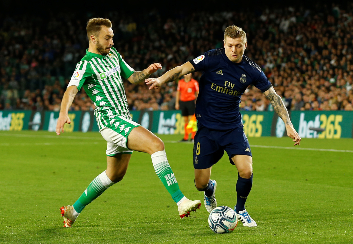 Soccer Football - La Liga Santander - Real Betis v Real Madrid - Estadio Benito Villamarin, Seville, Spain - March 8, 2020 Real Madrid's Toni Kroos in action with Real Betis' Loren REUTERS/Marcelo Del Pozo