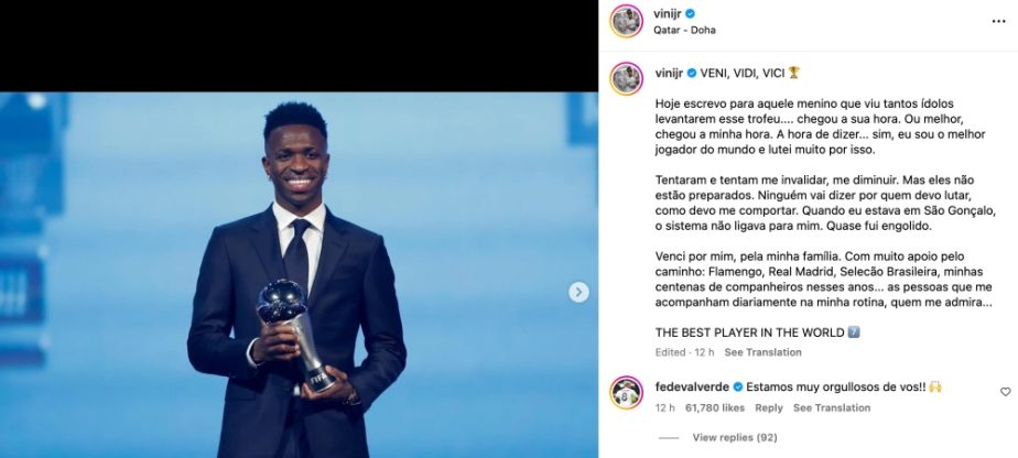 After losing the Ballon d’Or to Manchester City star Rodri a couple of months back, Vinicius Jr. climbed the top step on Tuesday, 17th December, winning The Best FIFA Men’s Player Award.