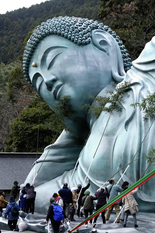 About 200 worshippers and others clean a nehanzo, or reclining Buddha, using poles with bamboo leaves during year-end cleaning called "susuharai" at Nanzoin temple in Sasaguri, Fukuoka Prefecture, on Thursday. Built in 1995, the 41-meter-long and 11-meter-high reclining Buddha is said to be one of world's largest bronze statues. Participants also cleaned the nehanzo with bleached cloths. A 69-year-old local resident said that she participated in the cleaning to express gratitude for her lack of difficulties in the past year and her hope for a peaceful Reiwa era.