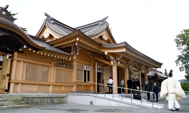 A ceremony was held Monday at Kumamoto Prefecture's Aso Shrine to mark the completion of reconstruction work on the worship hall, which collapsed in the 2016 Kumamoto Earthquake.