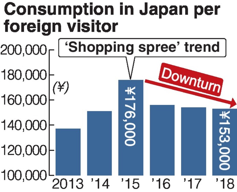 On the other hand, consumption per visitor has been sluggish in recent years. In 2015, when visitors from countries such as China purchased home appliances and daily necessities in bulk, which was dubbed a bakugai shopping spree, the per-visitor consumption reached about 176,000 yen. The figure has since declined to 153,000 yen in 2018. The decline is apparently due to the Chinese government's policy since 2016 to raise duties on goods purchased overseas and brought into China, as a measure to increase domestic consumption.