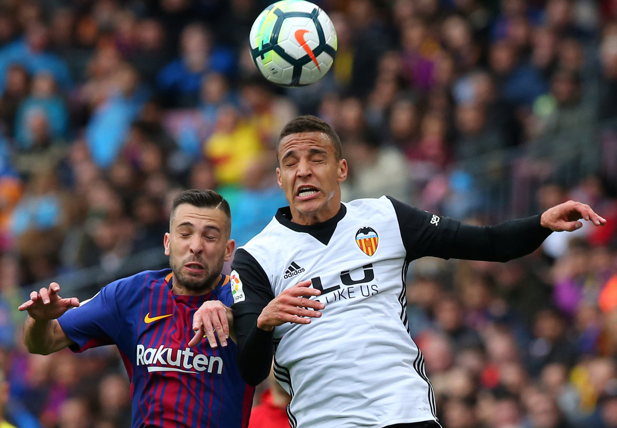 Soccer Football - La Liga Santander - FC Barcelona vs Valencia - Camp Nou, Barcelona, Spain - April 14, 2018 Barcelona's Jordi Alba in action with Valencia's Rodrigo REUTERS/Albert Gea