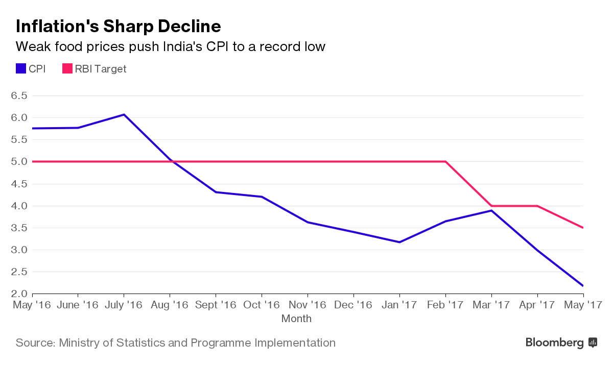 Consumer price inflation in the $2 trillion economy slid to fresh record low of 2.18 percent in May, figures showed Monday, below the 2.4 percent estimate in a Bloomberg survey of economists. The data come just five days after the Reserve Bank of India, led by Urjit Patel, refrained from cutting interest rates at its latest policy announcement, provoking a swift rebuke from Prime Minister Narendra Modi’s chief economic adviser.