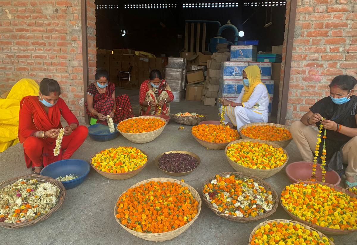 Sitting at plain wooden tables, women in face masks roll a brown paste into thin cylinders - helping to recycle some of the millions of tonnes of flowers that Hindu worshippers throw into the Ganges.