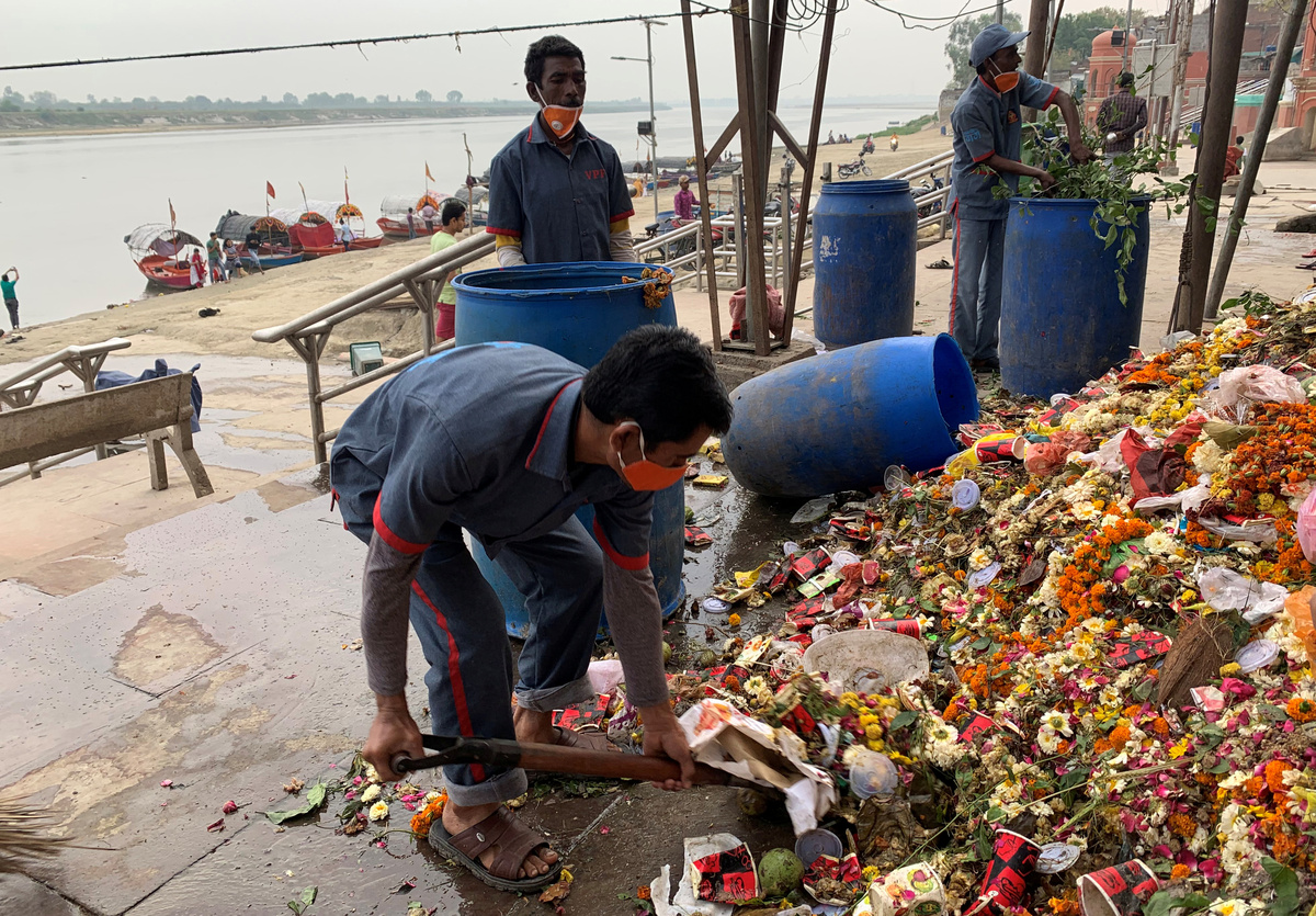 They are part of a 100-strong team working for entrepreneur Ankit Agarwal's Phool.co (flower), removing floral waste from one of the most polluted stretches of India's holy river in the northern city of Kanpur.