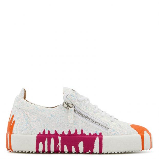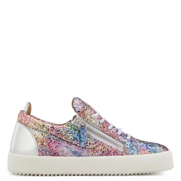 Sneakers in white glitter leather with a contrast splash print, and low-top sneakers featuring a multicolour glitter upper, equally make sparkling footwear.