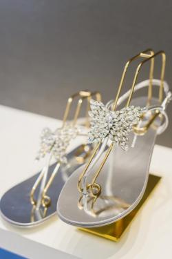 Crystal-embellished models range from flat sandals with a butterfly jewel appliqué and 4.5-inch sandals made from mythique fabric, adorned with crystals on the geometric ankle strap.