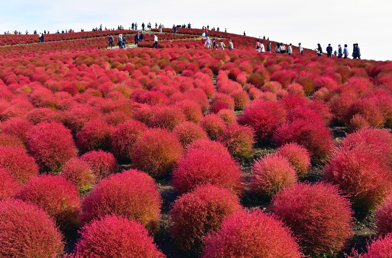 An entire hill is awash in color at Hitachi Seaside Park in Hitachinaka, Ibaraki Prefecture, as round kochia plants turn red with the coming of the autumn season.