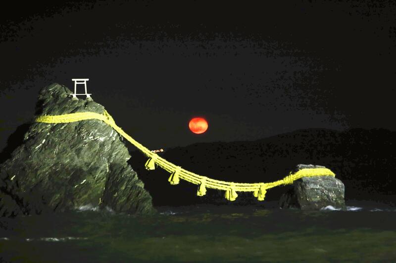 A magnificent red full moon could be seen rising between the Meotoiwa, or "married rocks," from Futami Okitama Shrine in Ise, Mie Prefecture, on Saturday evening.