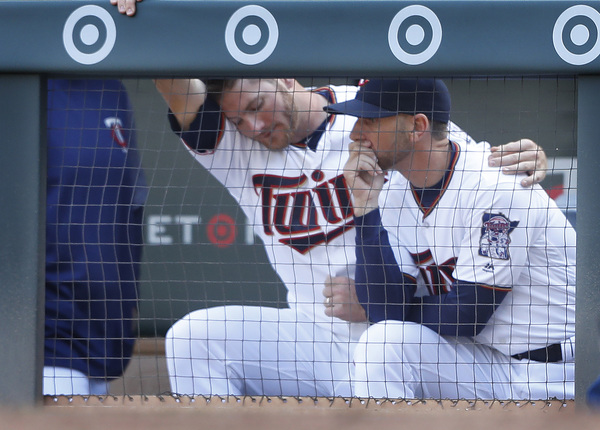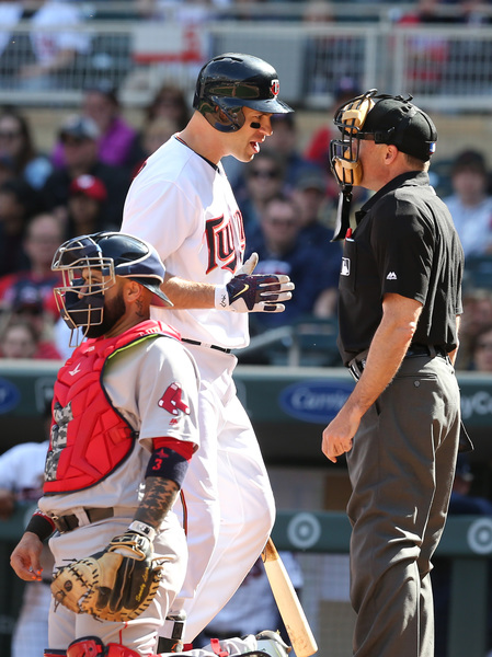 With a runner on third and one out, Boston manager John Farrell went to close Craig Kimbrel. Joe Mauer batted for Byron Buxton. Once down 0-2, Mauer worked the count full before Kimbrel got a called strike three on a breaking ball that was a borderline strike. The usually reserved Mauer tuned to home plate umpire Dan Iassonga and complained for several seconds, the longest he's ever objected to a call.