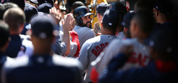 Santana threw 23 pitches in the first inning, many of them poorly. He ran a 3-2 fastball over the middle of the plate to Dustin Pedroia, who belted it into the seats in left to open the scoring. After hitting Xander Bogaerts, Santana's 1-2 fastball to Andrew Benintendi was hit into the seats in right for a two-run home run and a 3-0 Red Sox lead.