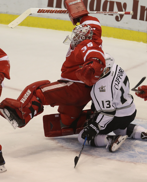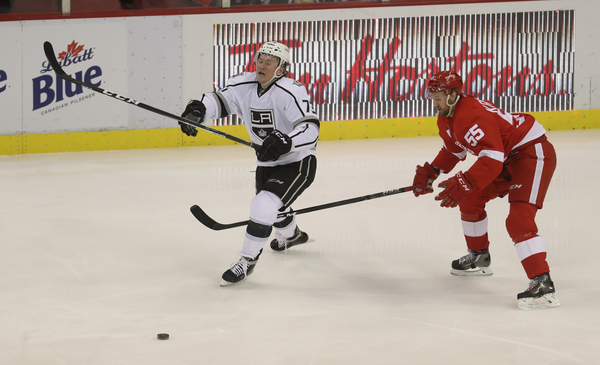 Athanasiou set up a chance for Mantha late in the period but Zatkoff denied the shot. The Kings got it to 2-1 on their 22nd shot, with 16.3 seconds left in the second period. Howard made the save on Nic Dowd's tip-in but couldn't get up in time to catch the rebound. It didn't help that Dowd was wide open. Nor that the Wings had just eight shots after two periods.