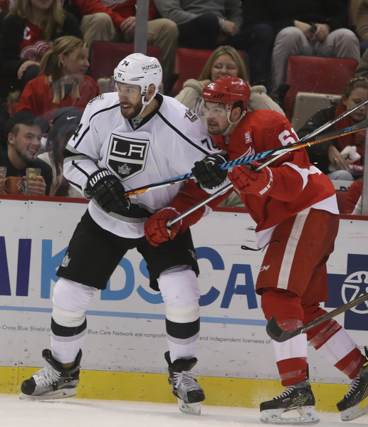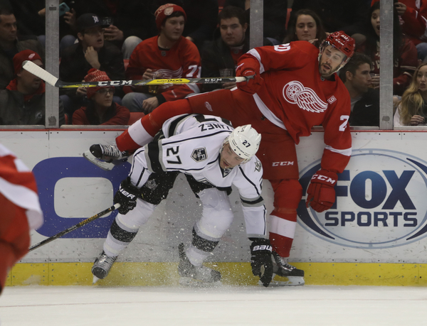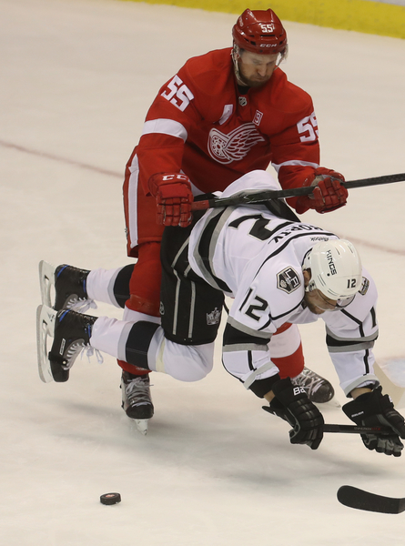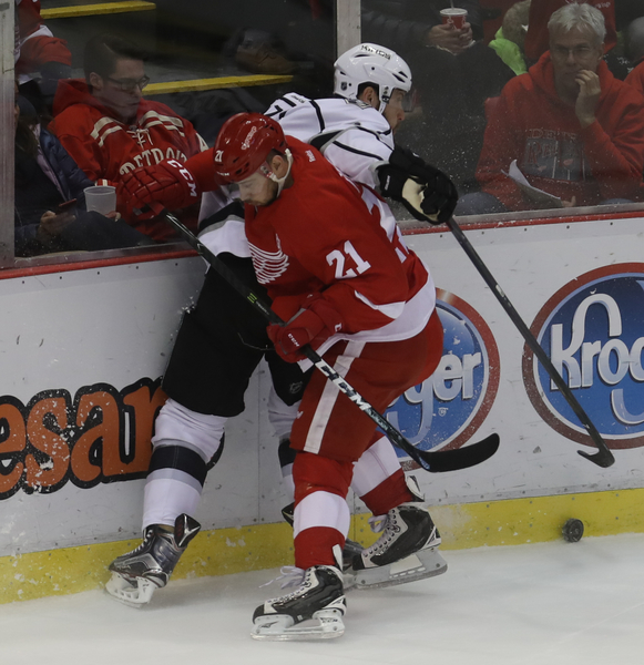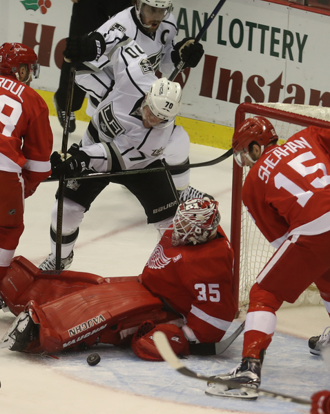 Thomas Vanek was mauled by Tom Gilbert on a breakaway early in the third period, sending both men crashing into L.A.'s net, dislodging the net before the puck crossed the goal line. That was only Detroit's ninth shot on goal. Gustav Nyquist hit a goalpost at the midpoint of the period, looking in disbelief as he remains at one goal the past 25 games. Frans Nielsen had a clear shot denied and nobody there for the rebound. The Kings promptly went down the other end and scored, with Tyler Toffoli shaking off Danny DeKeyser while driving the net. Several Wings would do well to take note of how that's done.