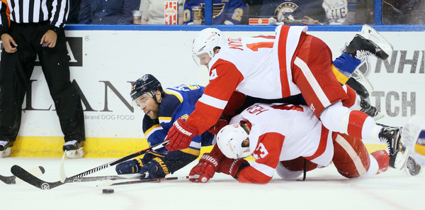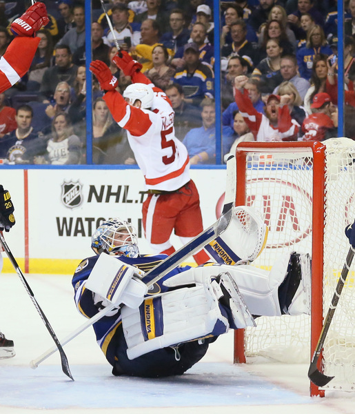 Statsny, right by the left goal post, sent the puck just wide as the power play expired in the opening minute of the second period. The Blues scored at 2:31 when Kevin Shattenkirk's shot redirected in off Frans Nielsen's left skate and past Mrazkek's right pad. The Blues continued to own the puck, relentlessly cycling in Detroit's zone with very few excursions by the Wings down the other end.