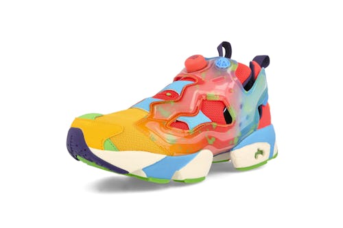 Yellow and green leather panels accent the mesh upper, while a multicolored translucent panel — spotted with green flecks to emulate a jelly bean — wraps around the top of the shoe. For even more color, blue and green decorate the sneaker’s sole unit, while red dresses the Instapump’s signature pump button.