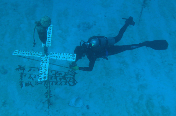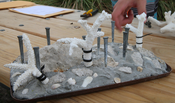 After cleaning barnacles and algae from the pipes and clipping branches, the team headed to a nearby reef to replant the corals by zip-tying them to nails hammered into the reef. The pruned corals also regrow faster, Hesley said, not unlike a rose bush.