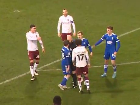 Ipswich pair Flynn Downes and Jack Lankester and Northampton defender Lloyd Jones stepped in and calmed the situation before Drysdale booked Judge.