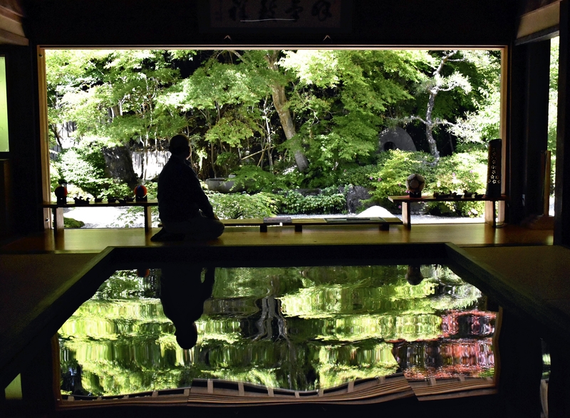 Fresh green leaves are reflected on an acrylic sheet inside a hall at Jufukuji temple in Sasebo, Nagasaki Prefecture. The temple started putting out the sheet to enjoy the reflections of autumn leaves in 2006 and began the practice for new green leaves in 2013. This year, the view will be open to the public from Saturday to May 21.