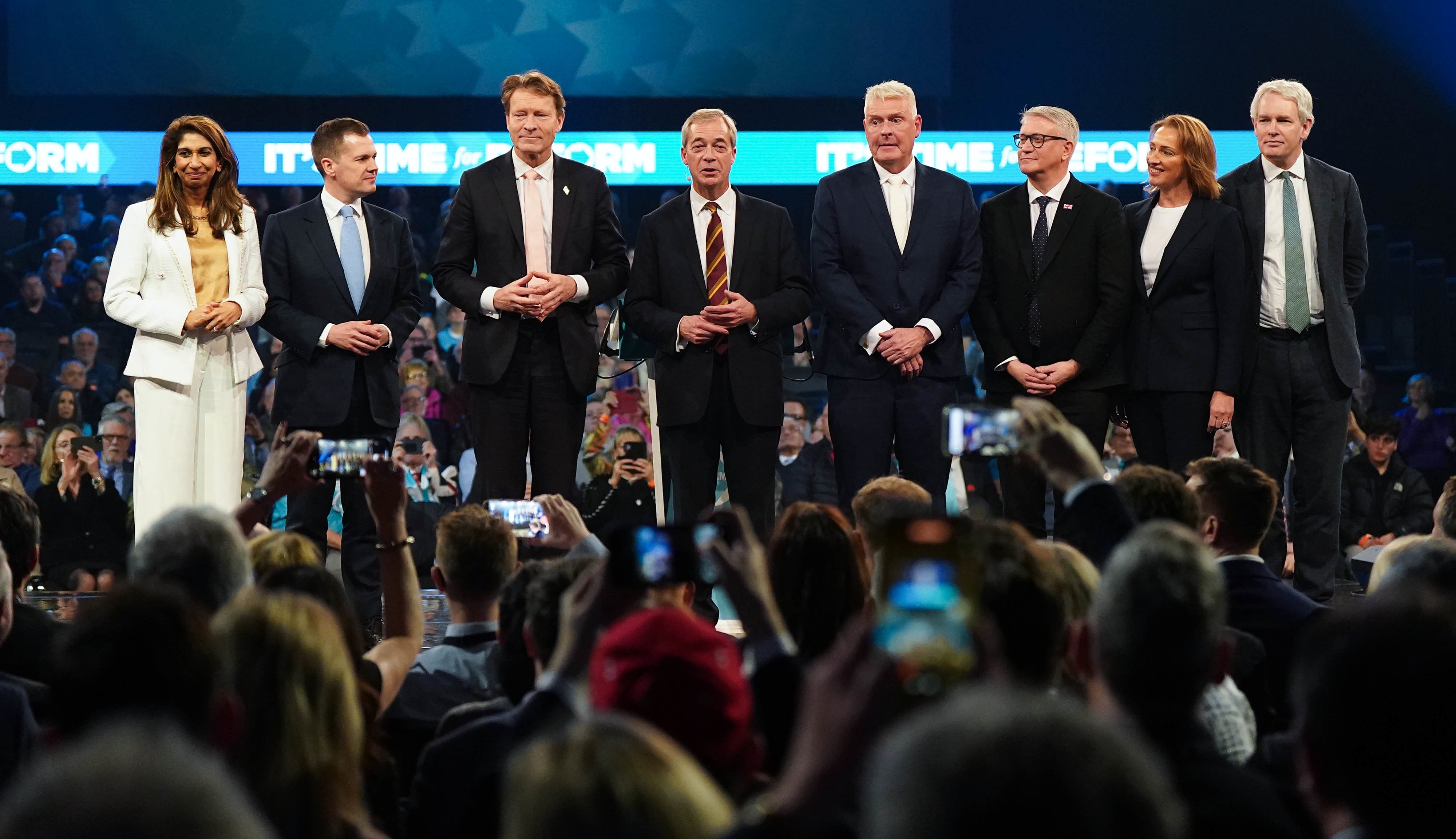 All of Reform UK’s MPs joined the party leader on stage at the end of the rally as Mr Farage welcomed those who have joined the team before they launched branded T-shirts into the crowd.