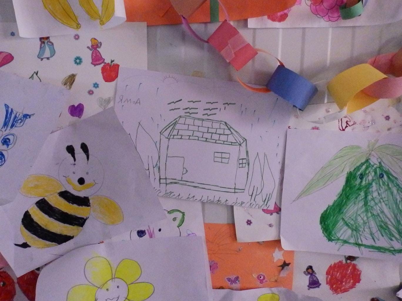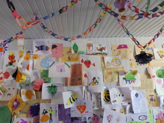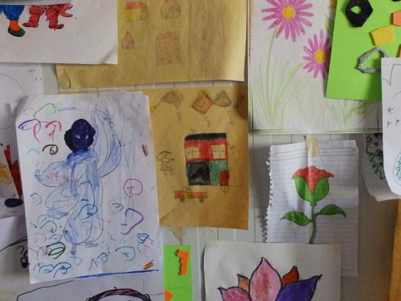 The walls of the temporary shelter they sit in are papered with colourful pictures, showing houses of all shapes and sizes sitting in neat gardens or with mountainous backdrops, dotted between images of food, animals and cartoon characters.