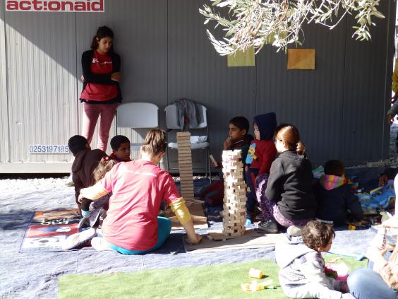 As we spoke, a young Syrian boy asked us to join in with a makeshift basketball game using a tennis ball and bucket, while toddlers played with toy cars and building blocks on the ground and older children had a game of football.