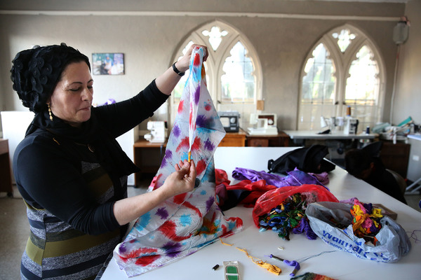 Hammadi and Hlaiwah Hussein help those who are new to sewing.