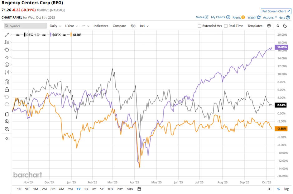REG stock has risen 1.6% over the past 52 weeks, lagging behind the broader S&P 500 Index's ($SPX) 17.4% increase. However, the stock has outperformed the Real Estate Select Sector SPDR Fund's (XLRE) 4.8% decrease over the same time frame.