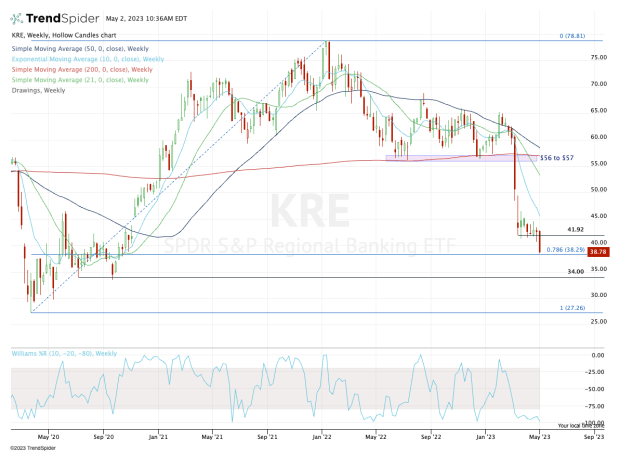 The KRE ETF had been bobbing around the $42 level, which had become key support since the regional-banking concerns began.