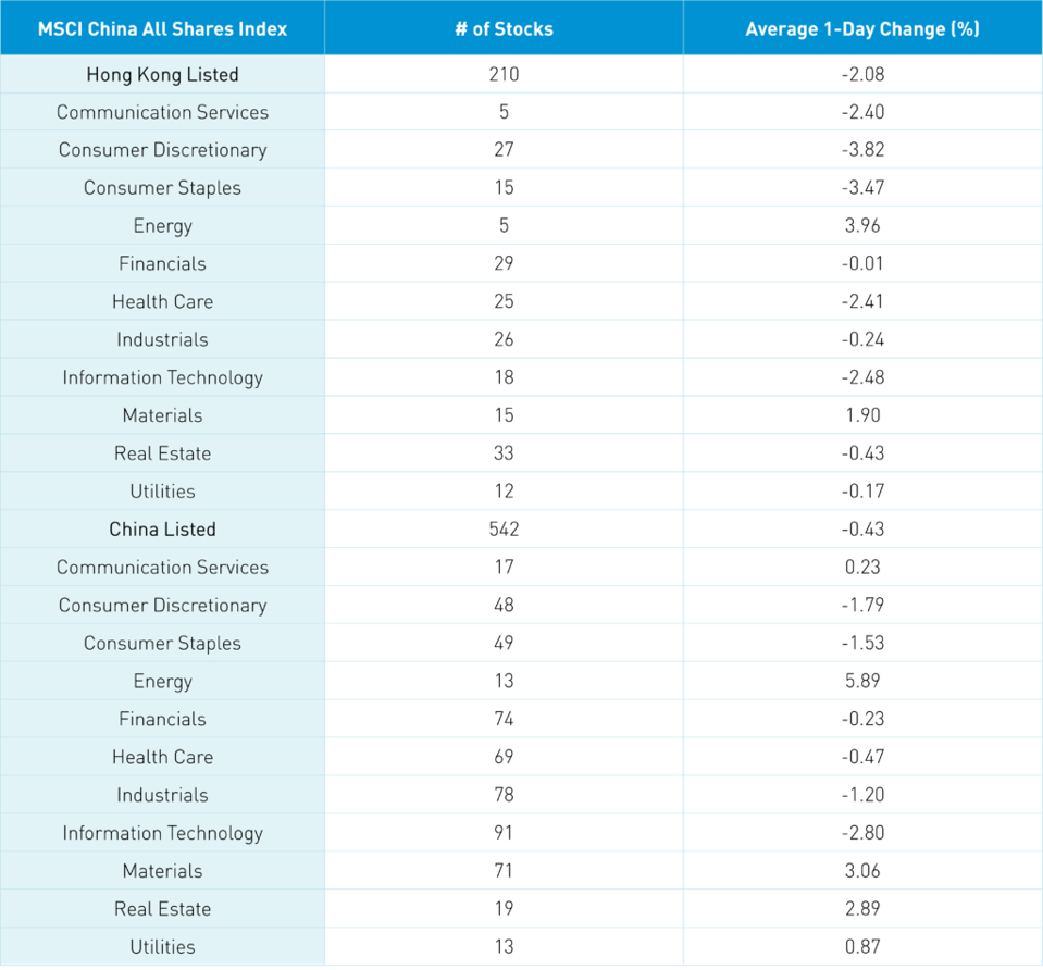 Shanghai, Shenzhen, and the STAR Board diverged to close +0.33%, -0.05%, and -2.97%, respectively, as volume declined -4.87% from Friday, which is 155% of the 1-year average. The 542 Mainland stocks within the MSCI China All Shares Index declined -0.43% with energy +5.91%, materials +3.08%, real estate +2.91%, and utilities +0.89%. Meanwhile, tech -2.78%, discretionary -1.77%, staples -1.51%, and industrials -1.18%. The Mainland’s most heavily traded stocks by value were COSCO Shipping, which gained +2.99%, TBEA, which fell -5.46%, China Northern Rare Earth, which fell -3.92%, broker East Money, which gained +2%, China Molybdenum, which gained +6.68%, Zijin Mining, which gained +3.51%, Aluminum Corp of China, which gained +10%, Tianqi Lithium, which gained +2.13%, Longi Green Energy, which fell -2.88%, and Jiangxi Special Electric Motor, which gained +9.99%. Northbound Stock Connect volumes were moderate/high as foreign investors sold -$592 million worth of Mainland stocks as Northbound Connect trading accounted for 4.5% of Mainland turnover.