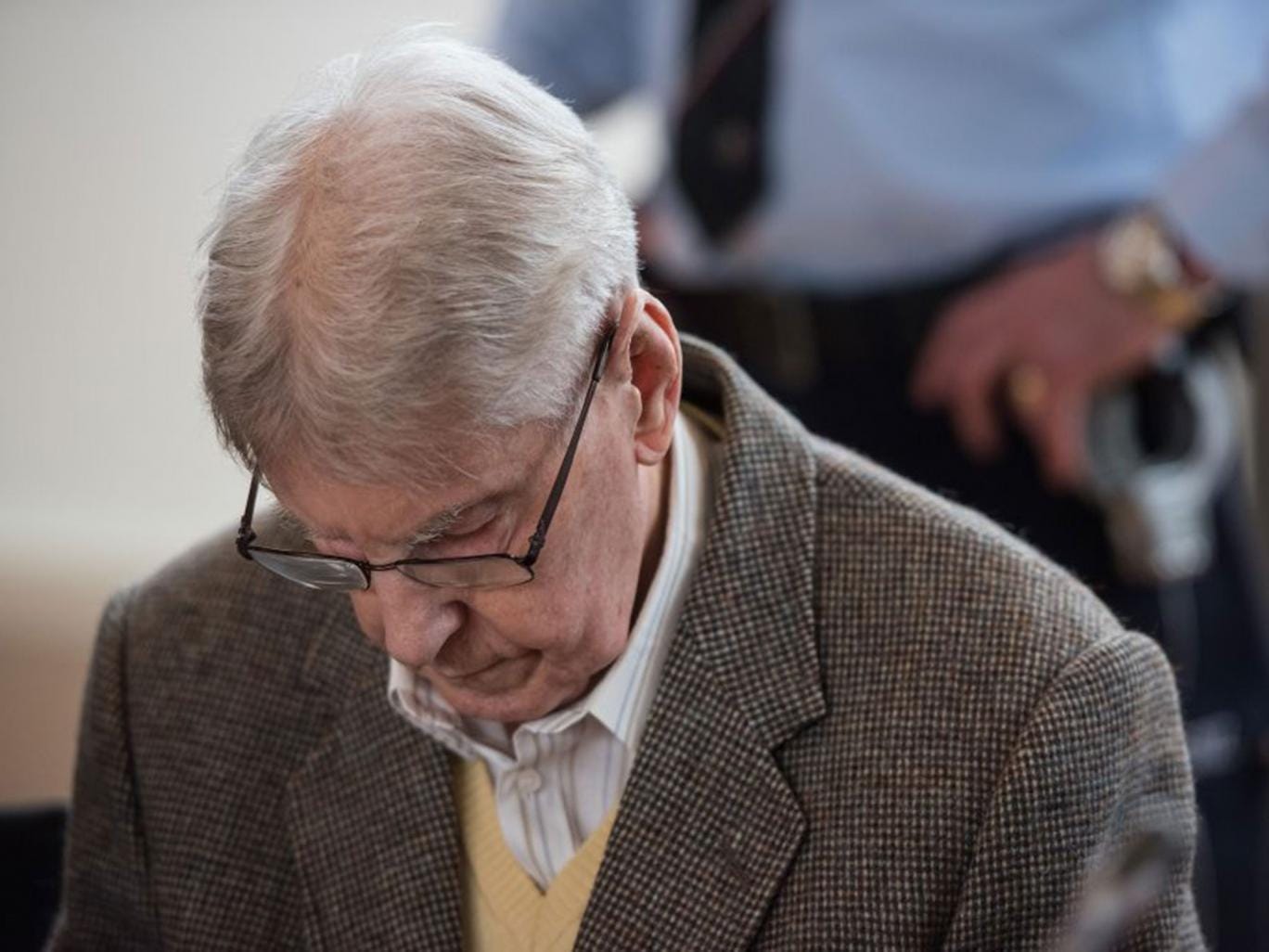 However 94-year-old Hanning, who appeared neatly dressed in a brown tweed jacket and bright yellow pullover, refused to respond. Instead the former guard, who worked as a small company director after the war, simply stared at the courtroom floor, his head under a mop of thick grey hair, his eyes partially concealed behind the thick glass of his spectacles.