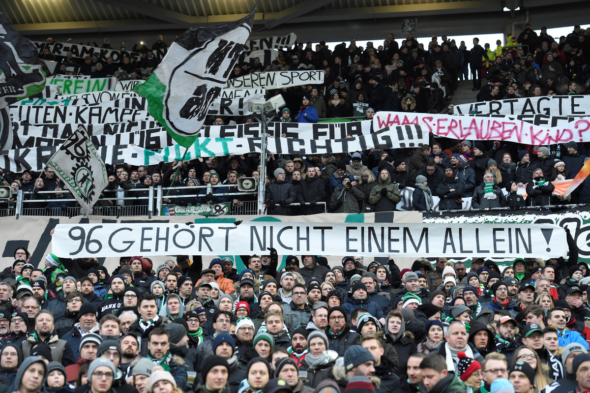 Soccer Football - Bundesliga - Hannover 96 v Bayern Munich - HDI-Arena, Hanover, Germany - December 15, 2018 Bayern Munich's Serge Gnabry (hidden) celebrates scoring their third goal with Thomas Mueller and team mates REUTERS/Fabian Bimmer DFL regulations prohibit any use of photographs as image sequences and/or quasi-videoSoccer Football - Bundesliga - Hannover 96 v Bayern Munich - HDI-Arena, Hanover, Germany - December 15, 2018 Bayern Munich's Robert Lewandowski scores their fourth goal REUTERS/Fabian Bimmer DFL regulations prohibit any use of photographs as image sequences and/or quasi-videoSoccer Football - Bundesliga - Hannover 96 v Bayern Munich - HDI-Arena, Hanover, Germany - December 15, 2018 Hannover fans display banners before the match REUTERS/Fabian Bimmer DFL regulations prohibit any use of photographs as image sequences and/or quasi-video