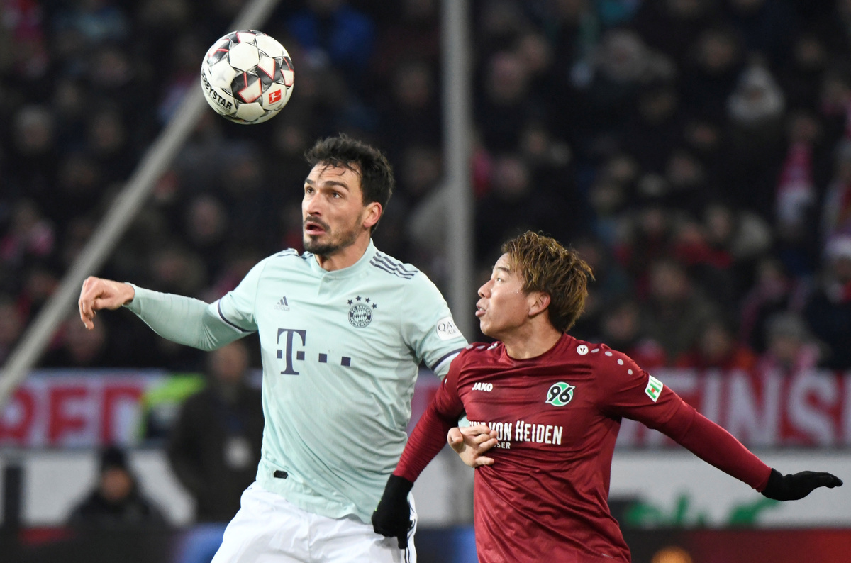 Soccer Football - Bundesliga - Hannover 96 v Bayern Munich - HDI-Arena, Hanover, Germany - December 15, 2018 Bayern Munich's Mats Hummels in action with Hannover's Takuma Asano REUTERS/Fabian Bimmer DFL regulations prohibit any use of photographs as image sequences and/or quasi-video