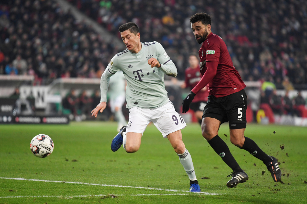 Soccer Football - Bundesliga - Hannover 96 v Bayern Munich - HDI-Arena, Hanover, Germany - December 15, 2018 Bayern Munich's Robert Lewandowski in action with Hannover's Kevin Wimmer REUTERS/Fabian Bimmer DFL regulations prohibit any use of photographs as image sequences and/or quasi-video