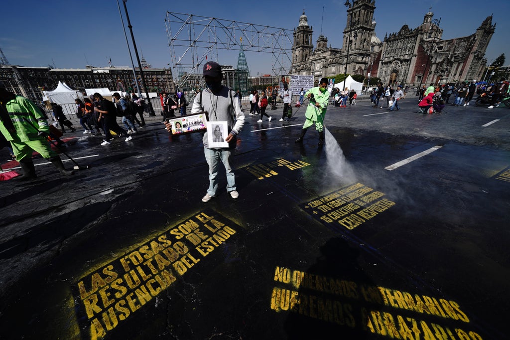 Families of missing Mexicans simulated one of the many clandestine burial sites dotting the country, dumping dirt and rock on part of the capital’s massive plaza Monday then digging it away to reveal their demands for the government to act.