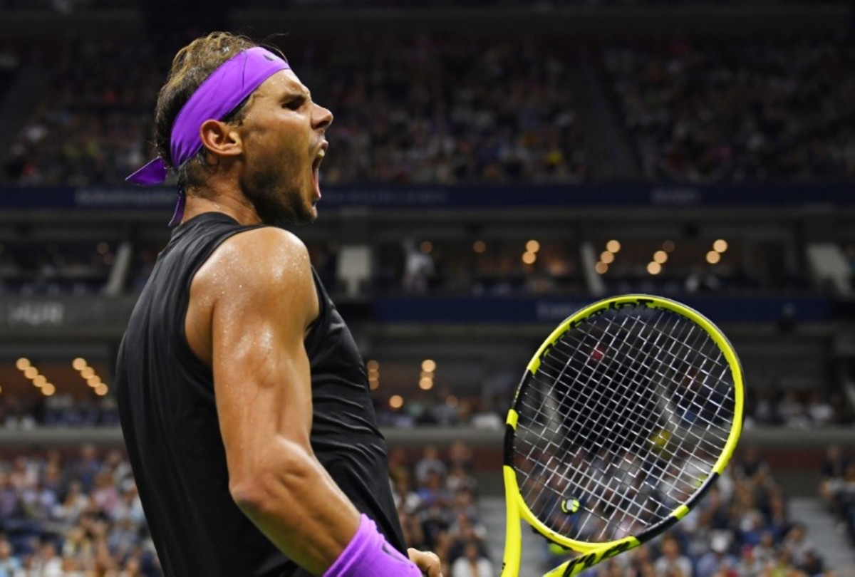 Sept 2, 2019; Flushing, NY, USA; Rafael Nadal of Spain celebrates after winning a point around the net post against Marin Cilic of Croatia in the fourth round on day eight of the 2019 U.S. Open tennis tournament at USTA Billie Jean King National Tennis Center. Mandatory Credit: Robert Deutsch-USA TODAY Sports