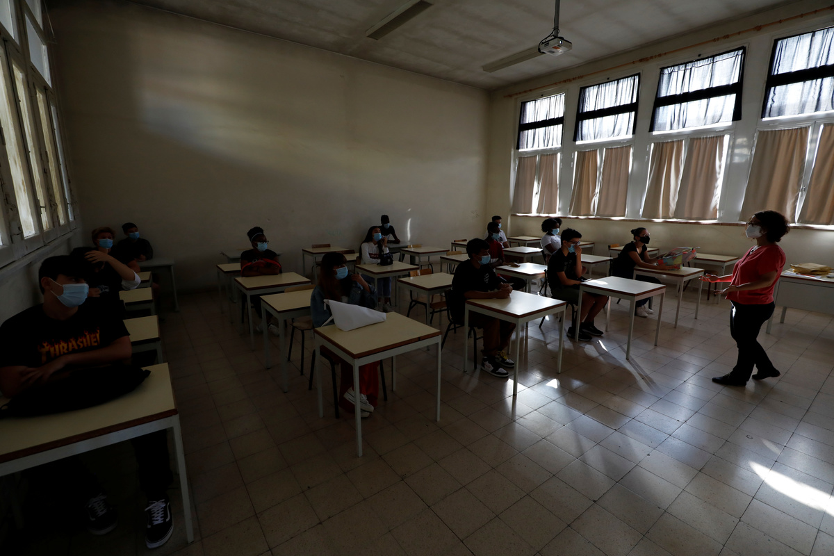 At the Maria Amalia high school in Lisbon teenagers were called into the classroom one by one and asked to disinfect their hands, while windows were left open.