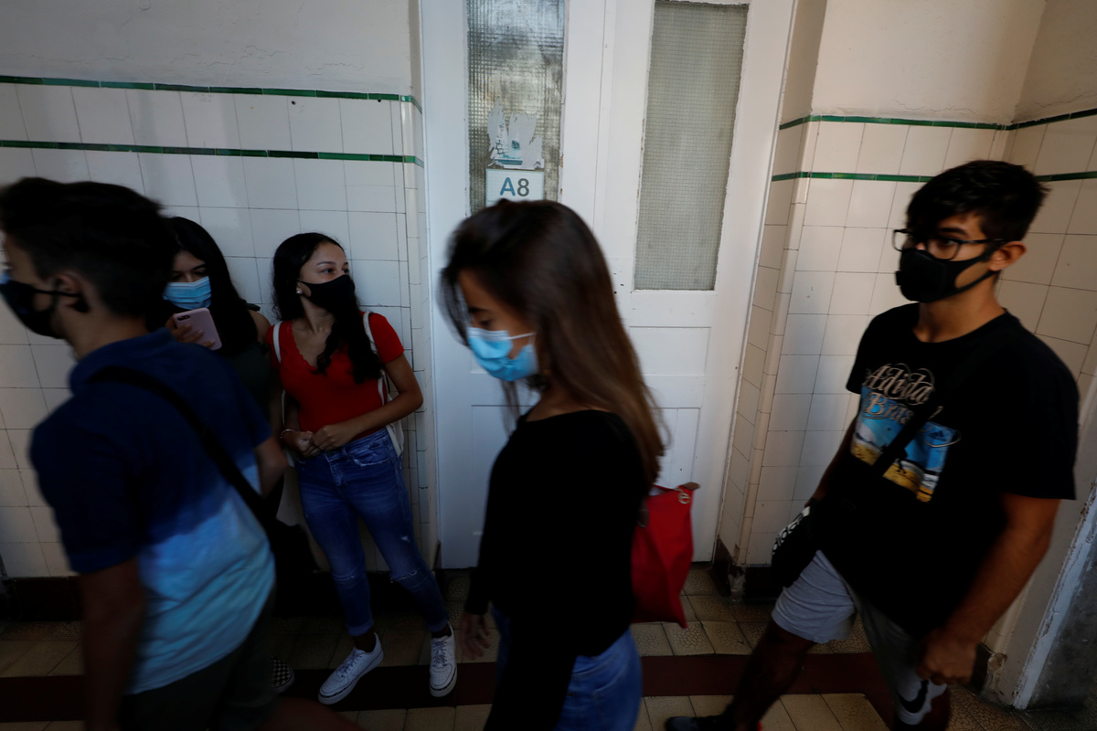 Standing next to her son as they waited outside, Alexandra Borges said she feared there would be new infections at school but going back to in-person classes was essential for pupils of all ages, including her son Pedro, who brought hand sanitizer inside his backpack.