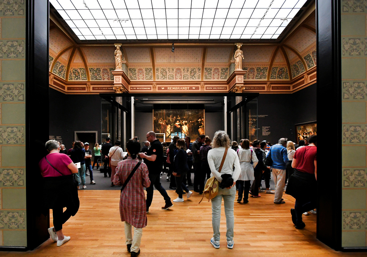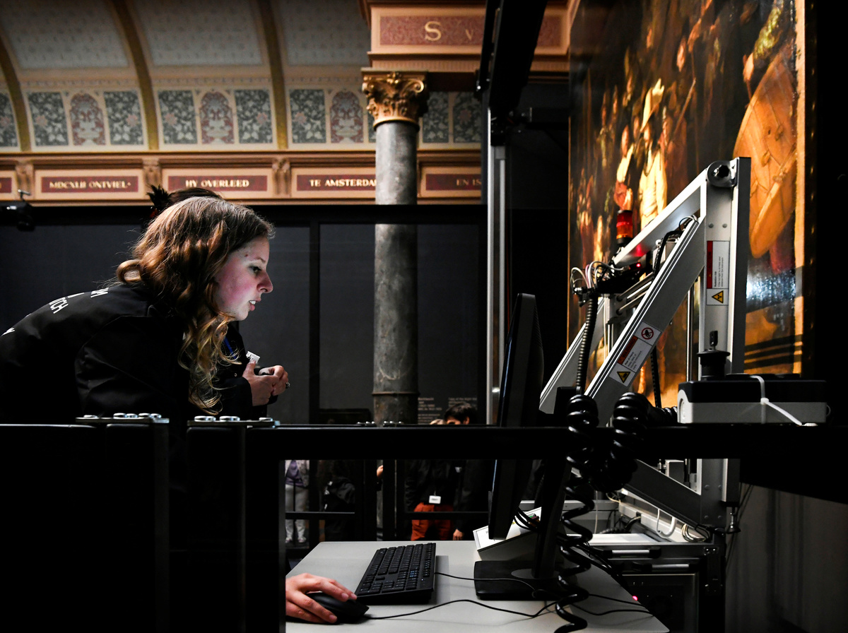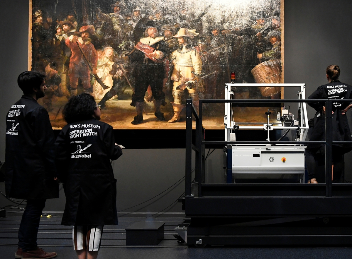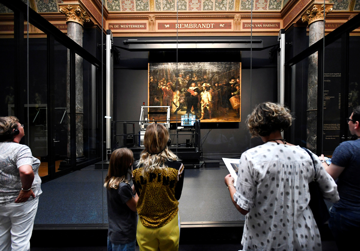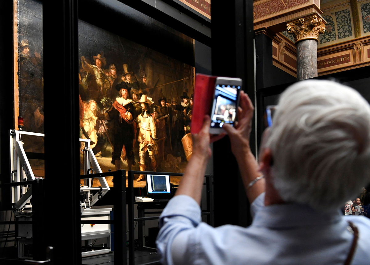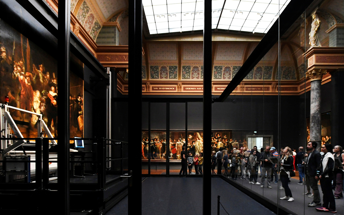 People look at Rembrandt's painting 'The Night Watch', protected by a glass barrier and video surveillance, as it undergoes public restoration after a first phase of study, in Rijksmuseum in Amsterdam, Netherlands July 8, 2019. REUTERS/Piroschka van de WouwA restorer prepares Rembrandt's famous painting the 'Night Watch', protected by a glass barrier and video surveillance, as it undergoes public restoration after a first phase of study, in Rijksmuseum in Amsterdam, Netherlands July 8, 2019. REUTERS/Piroschka van de WouwPeople look at Rembrandt's painting 'The Night Watch', protected by a glass barrier and video surveillance, as it undergoes public restoration after a first phase of study, in Rijksmuseum in Amsterdam, Netherlands July 8, 2019. REUTERS/Piroschka van de WouwA woman uses her phone to take pictures of Rembrandt's painting 'The Night Watch', protected by a glass barrier and video surveillance, as it undergoes public restoration after a first phase of study, in Rijksmuseum in Amsterdam, Netherlands July 8, 2019. REUTERS/Piroschka van de WouwRestorers prepare Rembrandt's famous painting the 'Night Watch', protected by a glass barrier and video surveillance, as it undergoes public restoration after a first phase of study, in Rijksmuseum in Amsterdam, Netherlands July 8, 2019. REUTERS/Piroschka van de WouwA restorer prepares Rembrandt's famous painting the 'Night Watch', protected by a glass barrier and video surveillance, as it undergoes public restoration after a first phase of study, in Rijksmuseum in Amsterdam, Netherlands July 8, 2019. REUTERS/Piroschka van de Wouw