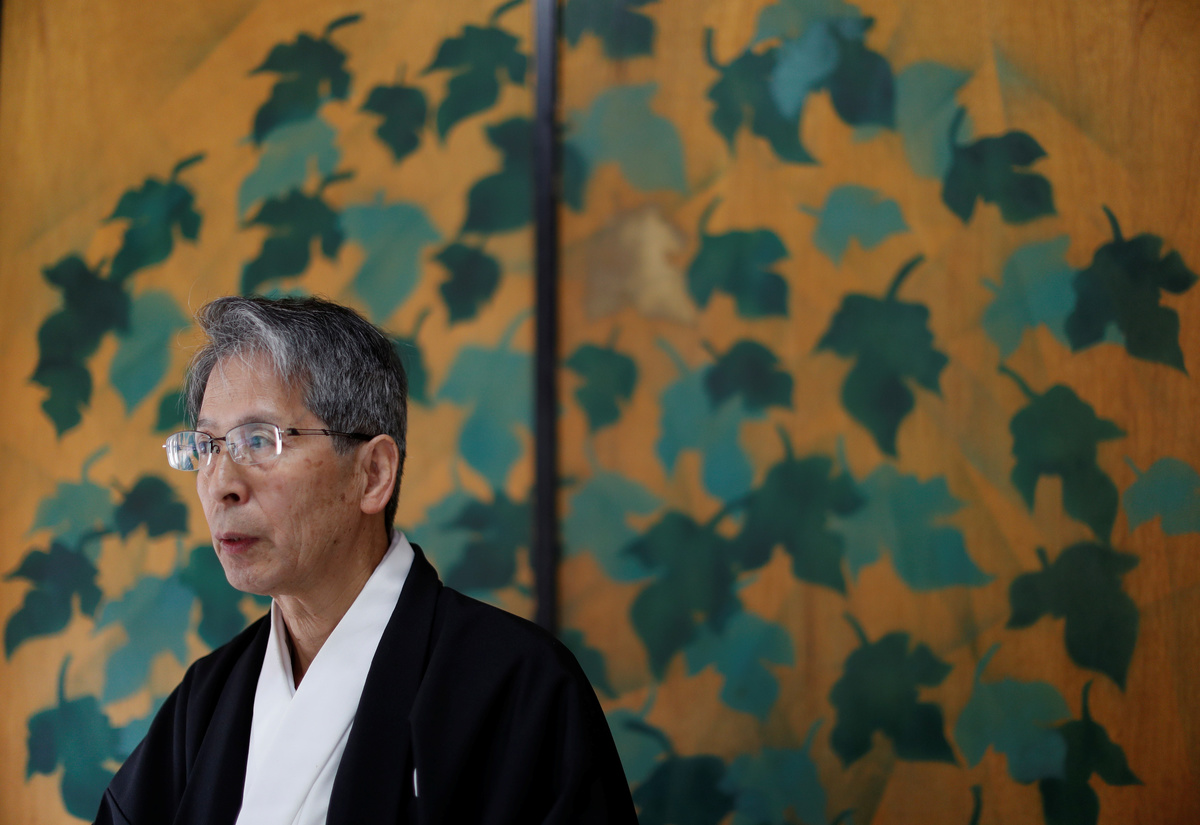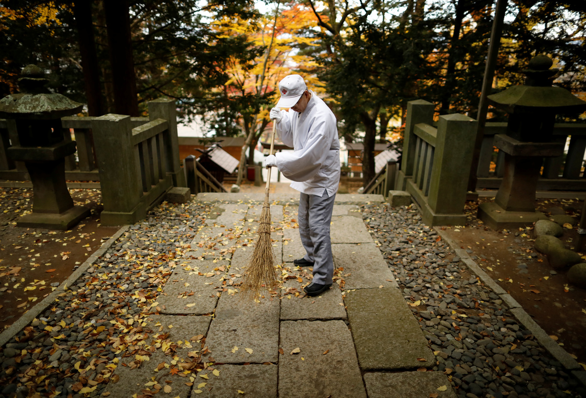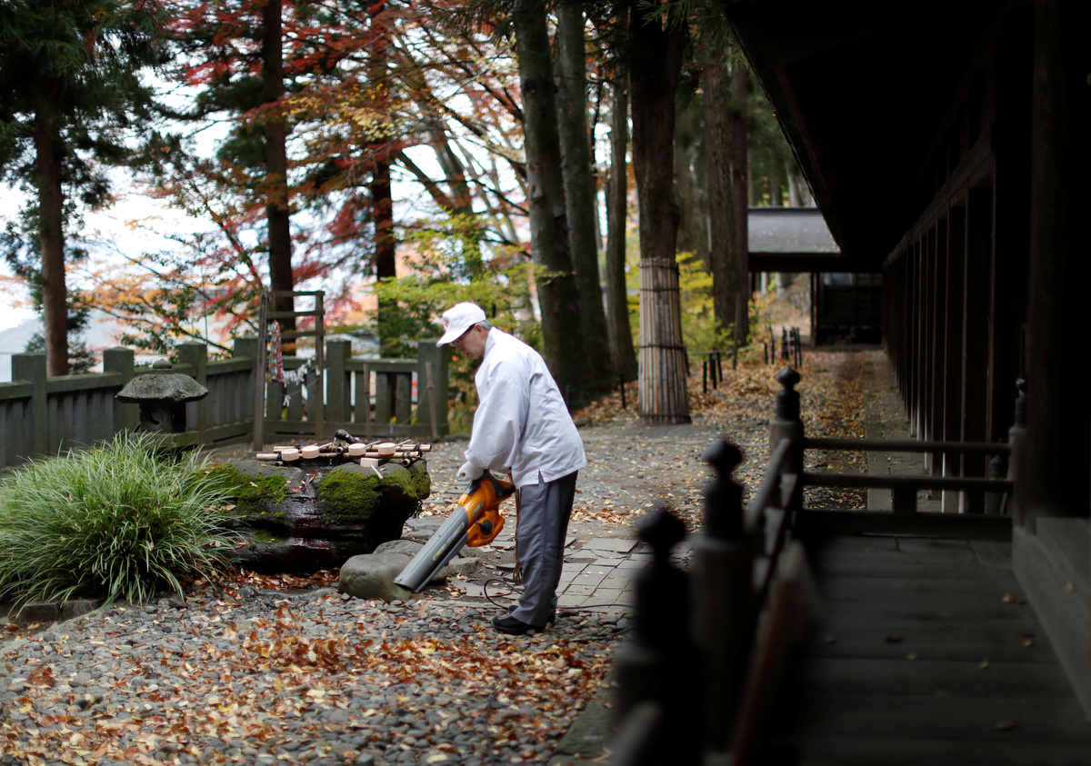 SUWA, Japan (Reuters) - Kiyoshi Miyasaka climbs the stone steps of his shrine, autumn leaves crunching under his feet. The Shinto priest, dressed in white, aims an orange leaf blower at a row of cobblestones and clears the path of fallen leaves.