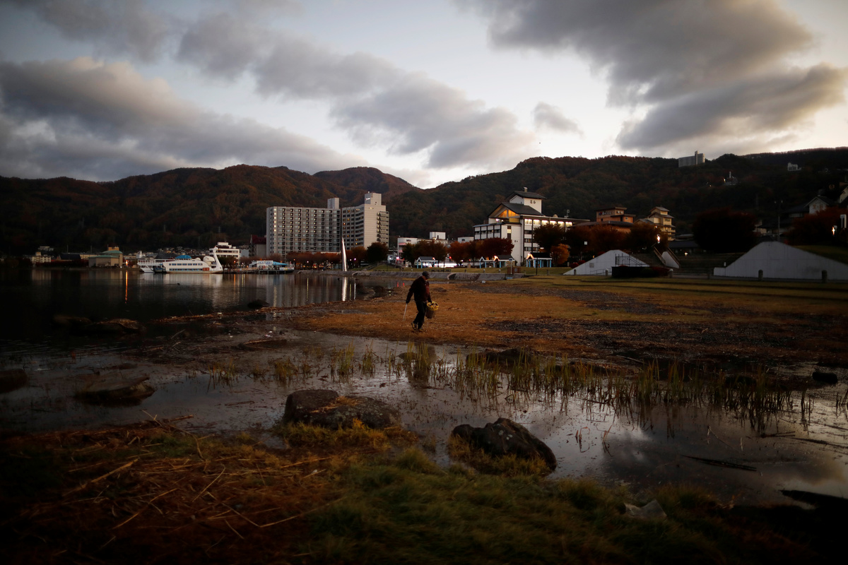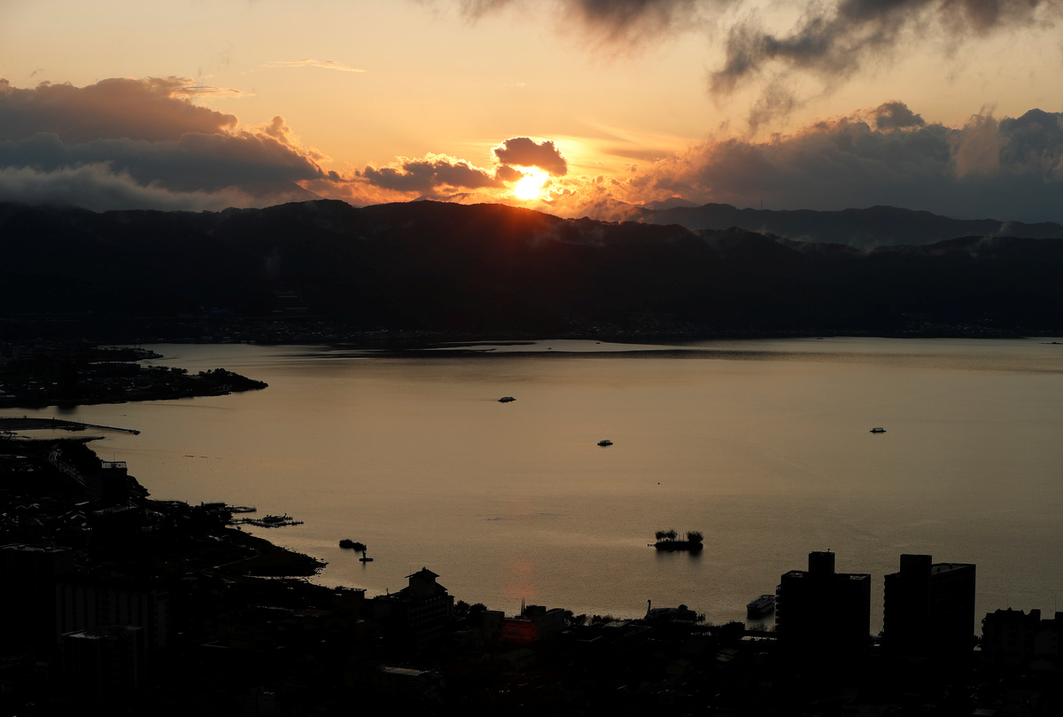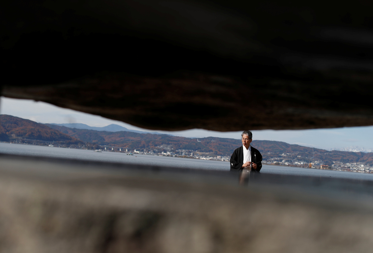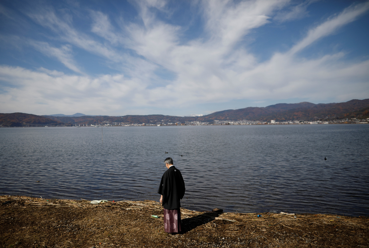 Below him, Lake Suwa looks like frosted glass, the surface mimicking ice so fragile it may crack at any moment. But the lake is far from frozen.